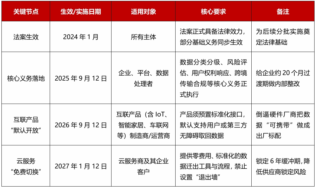 2026 年 9 月 12 日起,互联产品和相关服务的设计需默认向欧盟用户开放数据。用户可免费、便捷且安全地获取结构化、机器可读格式的数据,也可授权第三方共享数据,但被《数字市场法案》列为 “守门人” 的大型平台除外。B2C 场景下数据访问和共享全程免费,B2B 场景中数据持有者可收取合理费用。同时,数据持有者仅需共享原始数据和预处理数据,深度加工后的派生数据无需共享。