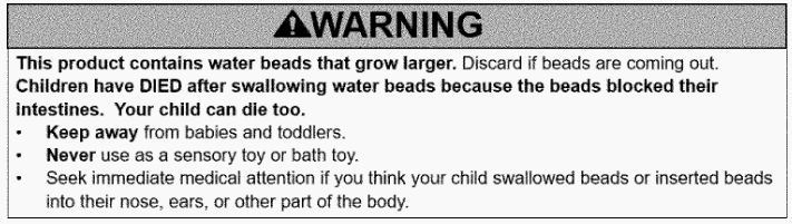 - 吸水珠玩具、吸水珠玩具的包装以及吸水珠容器须包含以下警告: