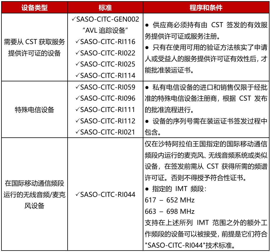 • 此类产品必须满足CST 在"SASO-CITC-GEN002"技术标准中的所有技术要求,并提供设备批准符合性表(附后)进行核查。