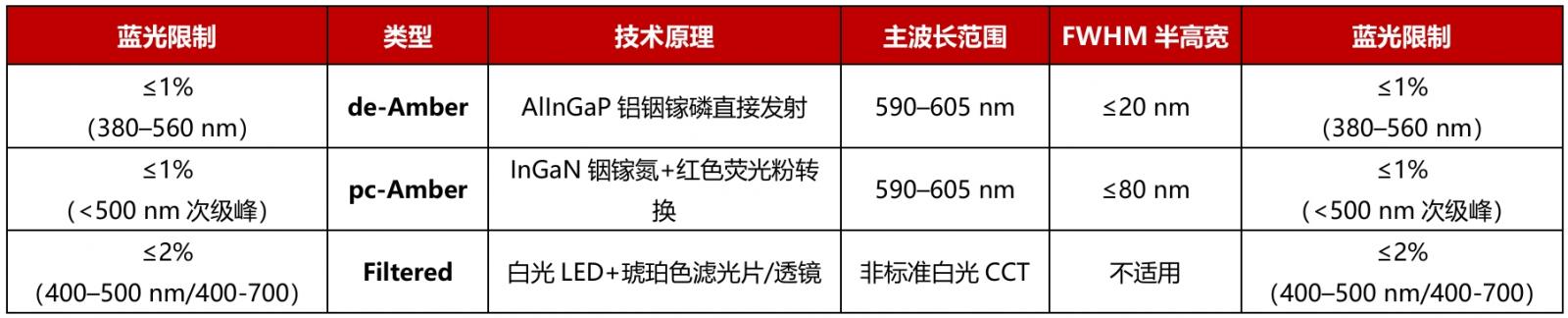 pc-Amber:荧光转换型(宽带琥珀光,蓝光占比≤1%)。